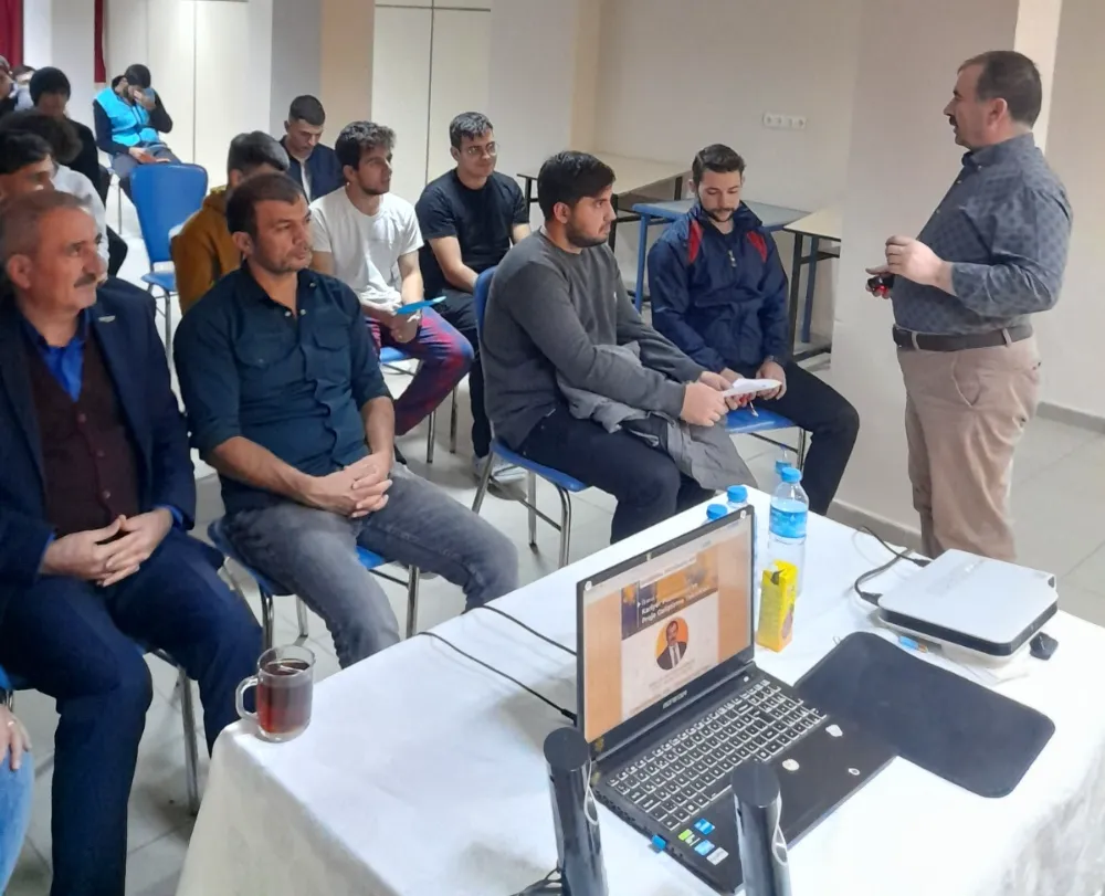 Daha konuşmasının başında etkileşimli bir iletişim dili ve samimi bir sohbet havası oluşturan Prof. Dr. Mustafa Böyükata, yurdun seminer salonunda yaptığı "Kariyer Planlaması ve Proje Geliştirme Teknikleri" konulu sunumunda duyarlılık, sorumluluk ve aksiyon almanın önemini ortaya koyan bir tartışma başlattı.